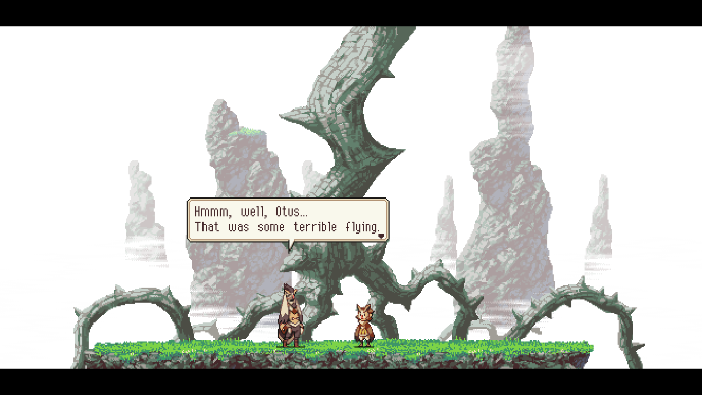 There are two truly beautiful moments in this game. One is the ending, and the other is a quiet moment between Otus and his mentor late in the game. As things look their bleakest, Otus’ mentor hugs him and says he’s sorry for everything, realizing he may never get another chance to say this. When the game prompts you to respond, Otus just pauses, and hugs back with all his might.