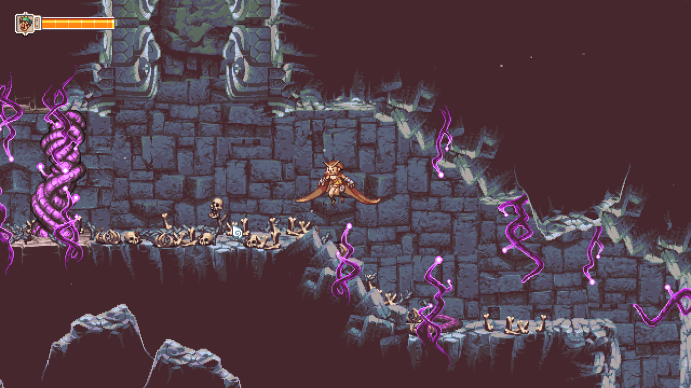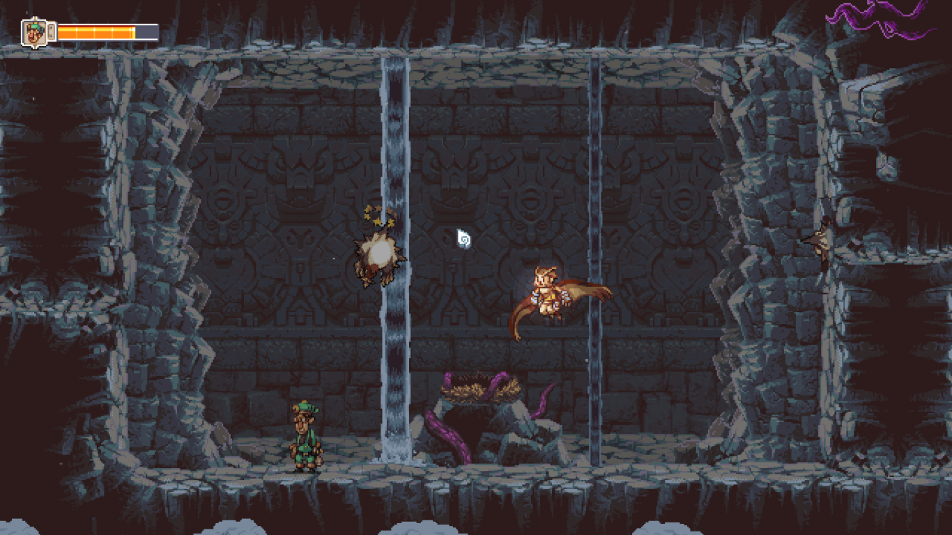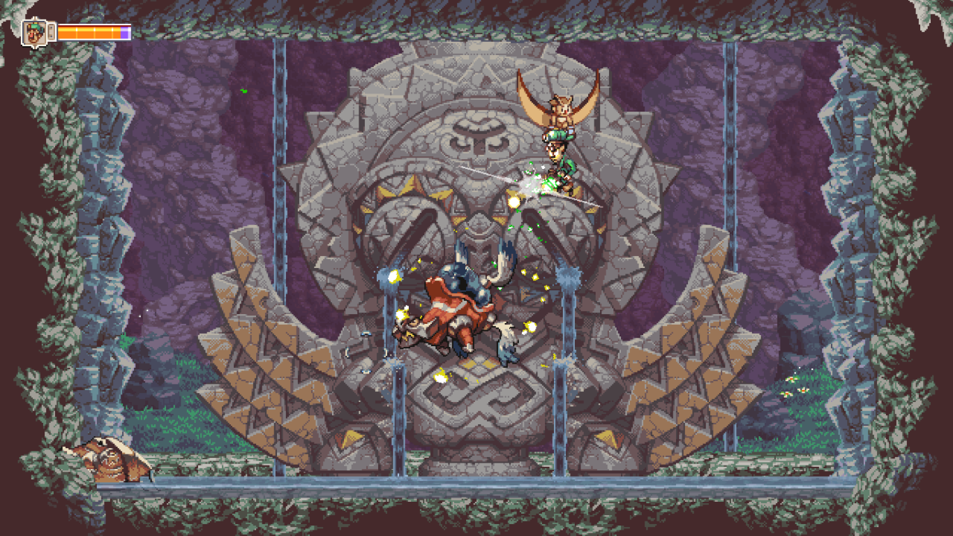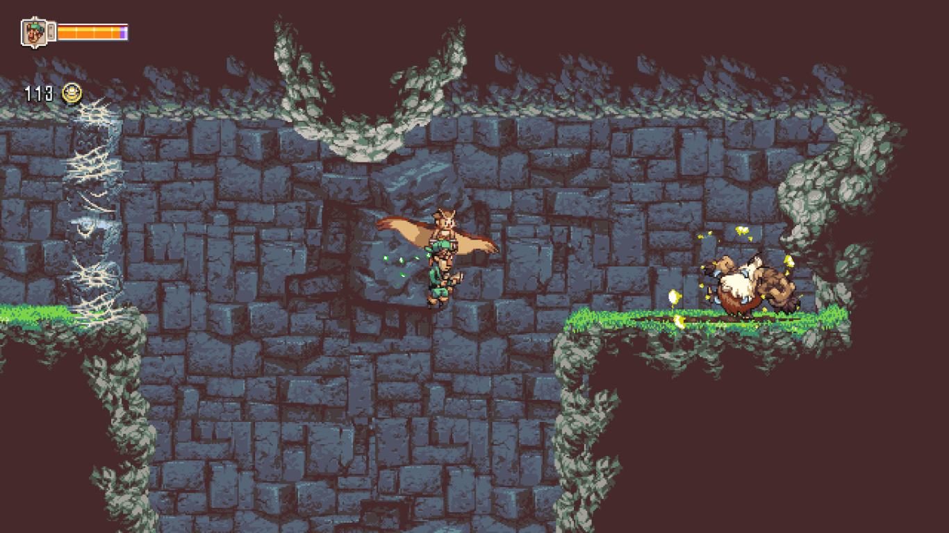 There’s a ton of focus on spectacle, which plays well with the platforming elements. Puzzles are usually traded out for big set-piece moments, like having to pilot a defeated boss through a storm of ruble or helping a wounded soldier bash through an enemy line. You can go pretty much anywhere in the world given, gaining more areas to explore as you gain new abilities. It does feel a little uncomfortable exploring, given that there’s no map function, but the levels are constructed that the way forward is usually clear, even when you need to double back to previously explored sections of the dungeons. There are also a lot of secrets to find, mainly buccaneer coins that unlock upgrades for main character Otus and friends at the only shop, and little mini-challenges to deal with you won’t see in dungeons, like one area populated by poisonous dandelions.