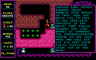 The game itself is a top-down puzzle/action game, with each level taking place on a single screen. It’s a little like a darker, grittier Lolo or Chip’s Challenge, in that respect. Everything happens in real-time, so sometimes quick reflexes are needed, although not quite to the extent of something like Crystal Caves. The goal of each level is to find all the needed objects, like keys or gems, and get to the exit. The hard part comes in how you clear your way to the objects and avoid the hazards and monsters guarding them.
