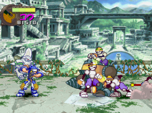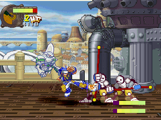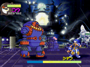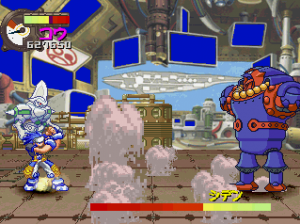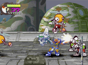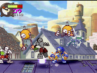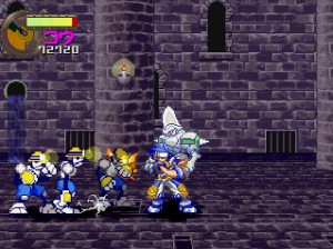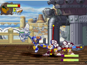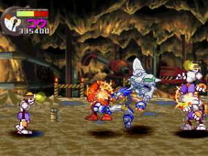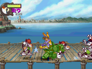 The basic fighting feels like Guardian Heroes, though a bit simplified. You have two primary attacks (weak and strong), and a variety of simple Street Fighter-esque command motions to perform flying flips, fireballs, and whatever other special moves your character may have (and in case you’re not adept enough, most of the specialty attacks are mapped to the extra buttons on the controller). Even the bulkiest of characters are relatively agile, allowing you to super jump, double jump, dash, and almost fly around the whole screen. Plus, it’s extremely easy to pick up enemies and chuck them into one another (an element inherited from Gunstar Heroes), tearing new holes in everything. Blocking happens automatically when you’re in a neutral pose, plus you can deflect enemy attacks, giving the action an extremely aggressive feel. Hitting the trigger buttons will send your character leaping back and forth between planes, though there are only two compared to Guardian Heroes‘ three. There’s also the usual power meter, which can unleash a super attack when charged up enough. And as is natural for games of this type, you can choose to smash bad guys with a buddy by your side. Though it only offers a two-player simultaneous option in story mode, multiplayer mode offers up to four, providing you have a multi-tap or are playing on a PlayStation 3. It’s all reasonably simple, but a total blast to play.