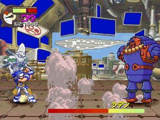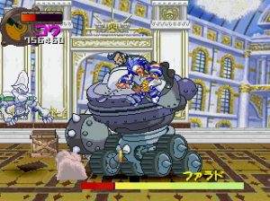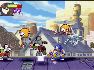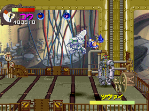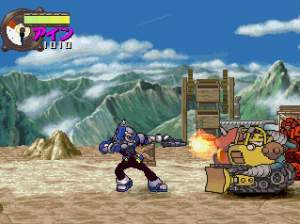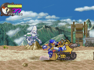 Panzer Bandit throws a lot at you at one time, but never quite reaches the epic chaos that Guardian Heroes immersed you in. While at times the game doesn’t quite feel busy enough, it also doesn’t overwhelm you to the point where you can’t see what you’re doing. While the foreground is polygonal, everything else is comprised of fully detailed, well-animated sprites. Even though the camera is constantly zooming in and out as you jump or switch between planes, the graphics stay fairly clear and never become the pixelated mess usually associated with scaling effects. The music is also similar to Capcom-style pop cheese that would feel right at home in a CPS2-era fighting game.