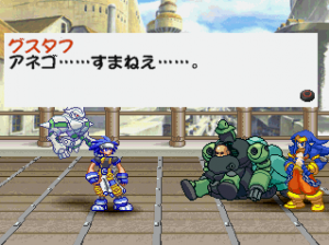 As for the main characters, Kou is the standard blue-haired anime hero who can shoot fireballs, and has a floating robot buddy to assist him as well. Kasumi is a ninja girl who attacks with a robotic girl by her side. These little helper pets travel alongside the player characters, though given that they really only perform super attacks, their full potential is never reached. Miu is an insanely cute little girl who rides on top of a gigantic mecha. She’s skilled at piloting this device even though she seems to have trouble with them. Finally, Ein is a badass robot filled with guns, lasers, and bombs – and he smokes a cigar.