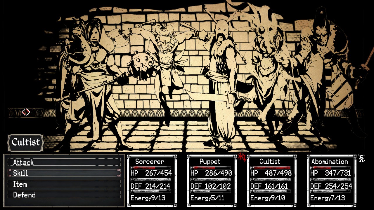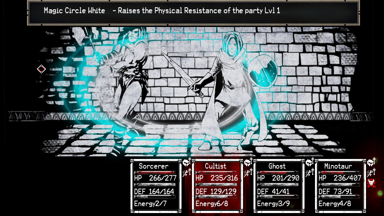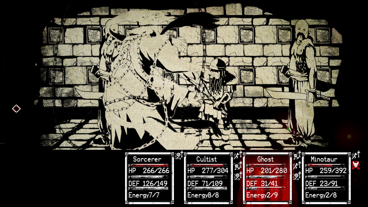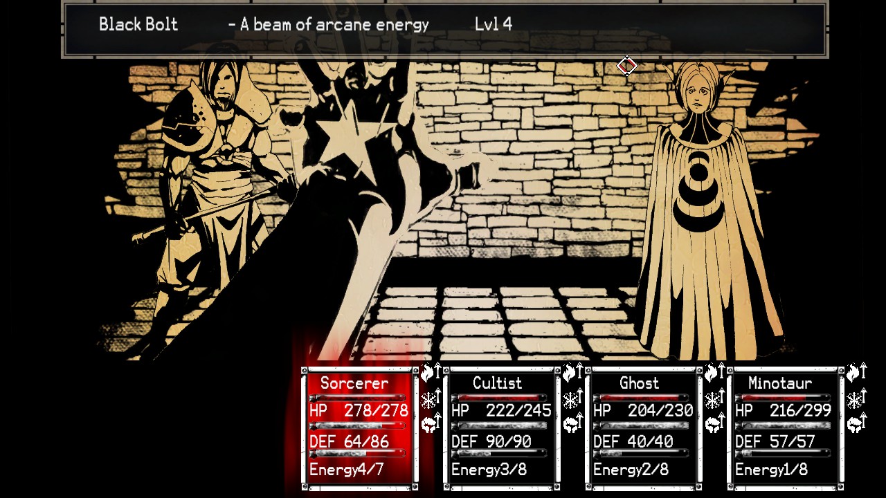 The game opens with a simple, fairytale-like animation showing a party of four heroes sealing a powerful evil sorcerer inside a magical book, the Librum Claustrum (actual Latin should read “Liber Claustrum”, but whatever). The rest of the game focuses on the unnamed sorcerer, the player character, and his escape from this mystical prison. For this, the sorcerer (by default a man who looks a bit like Elric of Melniboné, but there’s also a female option with only cosmetic differences) has a few allies on his side. One is the Spirit of the Book, who helps him escape the Librum for reasons that will become clearer the further he delves into the dungeons. The others are his former minions, every one of them based on a RPG mainstay, both as classes and as random encounters: the Goblin is a fast and sneaky thief, the Minotaur acts as a barbarian/tank, the Cultist is the healer/cleric, and so on.