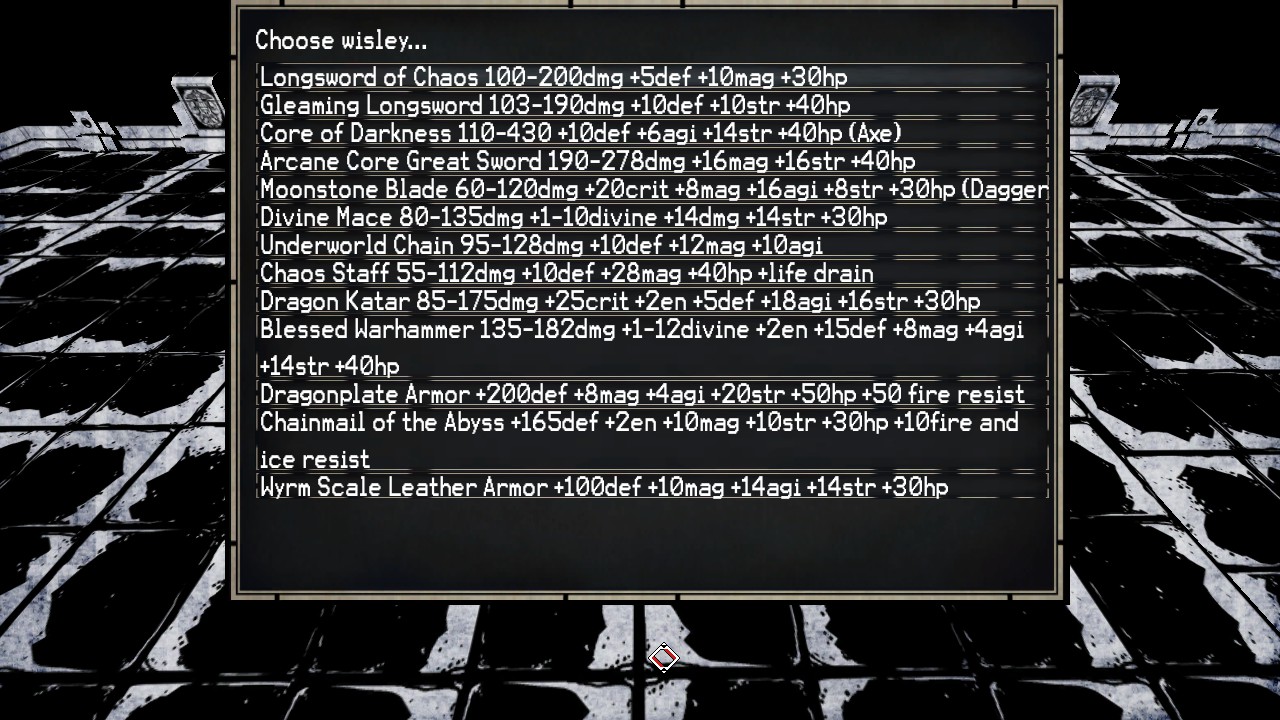 The progression of the characters is almost exponential: They gain a bunch of new powerful abilities at high levels, making early floors feel much harder than the later game, save for the final gauntlet of levels. This is even more so if you grind in the catacombs and use some tricks like saving and reloading before picking up any item (loot is randomly generated, so you could either pick up some rags or a Mithril Mace of Doom +50). The game feels a bit unbalanced as a result, and this leads to strange situations like finding some of the bosses much easier than high-level random encounters, who can wipe out our entire party in a couple of turns. And this even includes the encounters with the four legendary heroes who sealed the sorcerer in the first place! Come to think of it, why would they even be inside the very same trap they sealed their archenemy in?