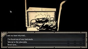 After beating the first boss, the sorcerer gains access to the Sanctuary, a hub where he and his cohorts can rest and buy equipment from a zombie, or raise their stats by paying a demonic trainer. The Sanctuary also houses a mysterious character (pretty heavily implied to be the Grim Reaper) who will reward the sorcerer by opening a level of the catacombs every time you bring him the escaped souls that can be found somewhere in hidden areas of the dungeons. The catacombs are full of treasures and powerful equipment, but also more combat-heavy than the regular dungeons. Expect to be ambushed often. On the other hand you can use the catacombs to grind and gain some extra levels, as the number of encounters in the dungeons are finite.