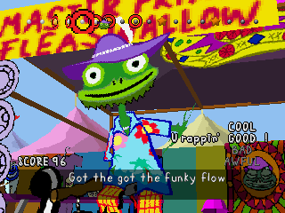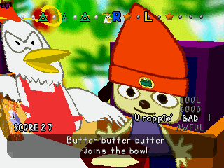Each level in PaRappa has you being taught by a teacher who’ll rap a line, which you then have to repeat. Mechanically, this means paying attention to the pattern of buttons displayed on the line at the top of the screen, and pressing those buttons at the right time when it’s your turn. Each button plays a specific phrase or word, so you can press the buttons and rap each part whenever you like – you can even freestyle by pressing certain buttons repeatedly. This can come in very handy when trying to maintain your ranking, which ranges from rapping “Cool” to “Good” to “Bad” to “Awful”.