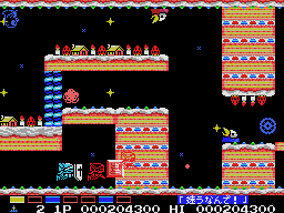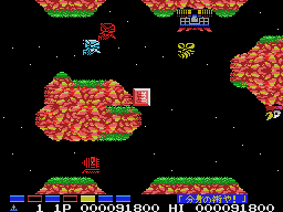 Enemies drop bell power-ups, similar to TwinBee. However, the effects of the bells are much different than later games. In addition to extra types of lasers, there are also “yoko warp” and “tate warp” functions, which let you warp around the left / right and top / bottom of the screen respectively. It’s incredibly weird, and the yoko warp is actually required in a few areas to get past otherwise unavoidable walls.