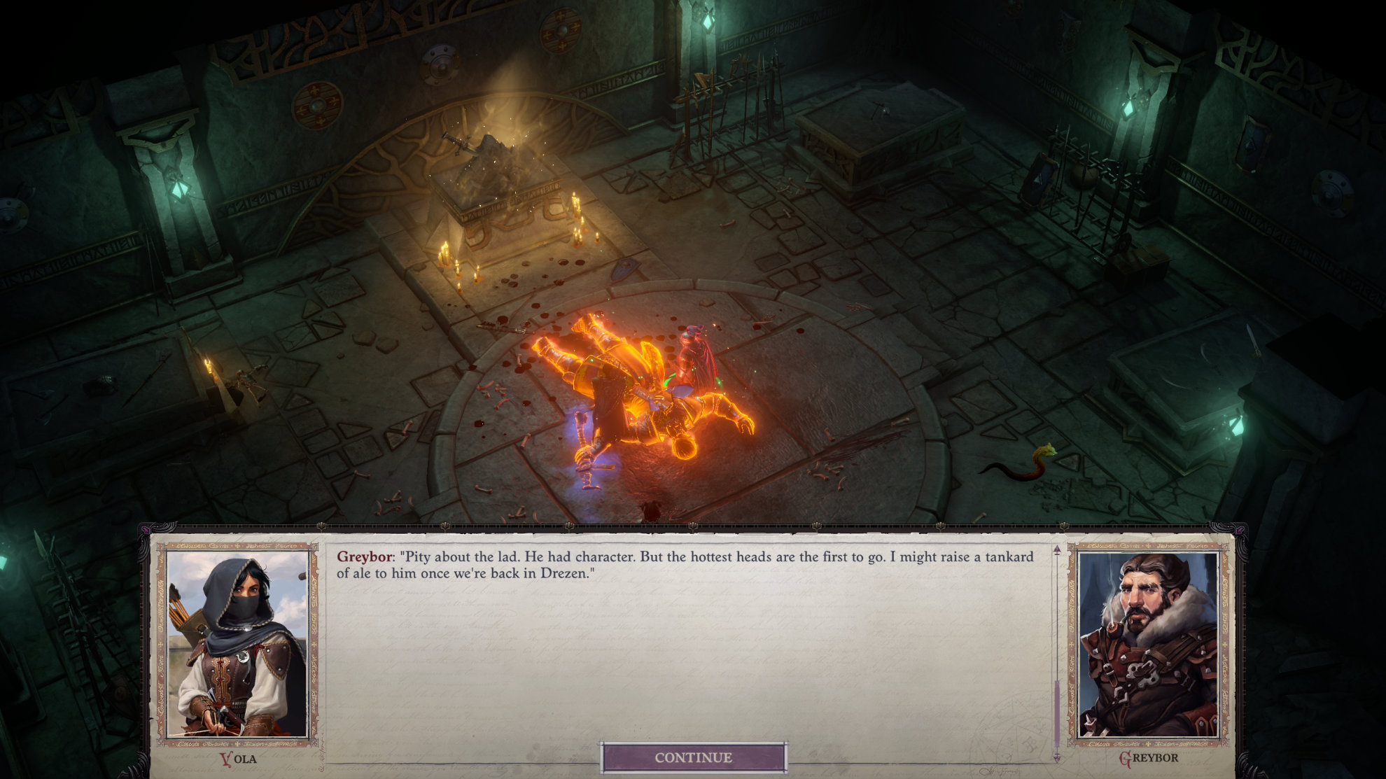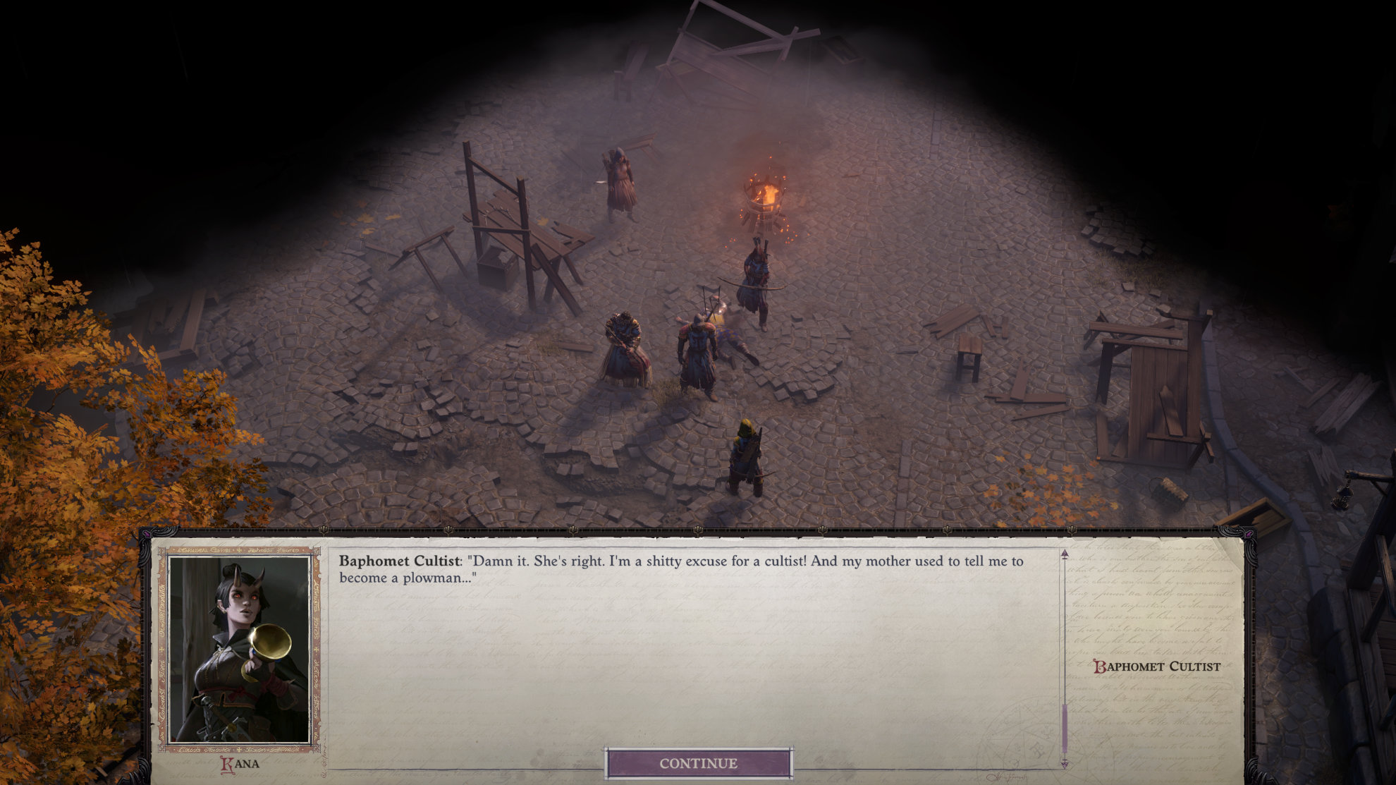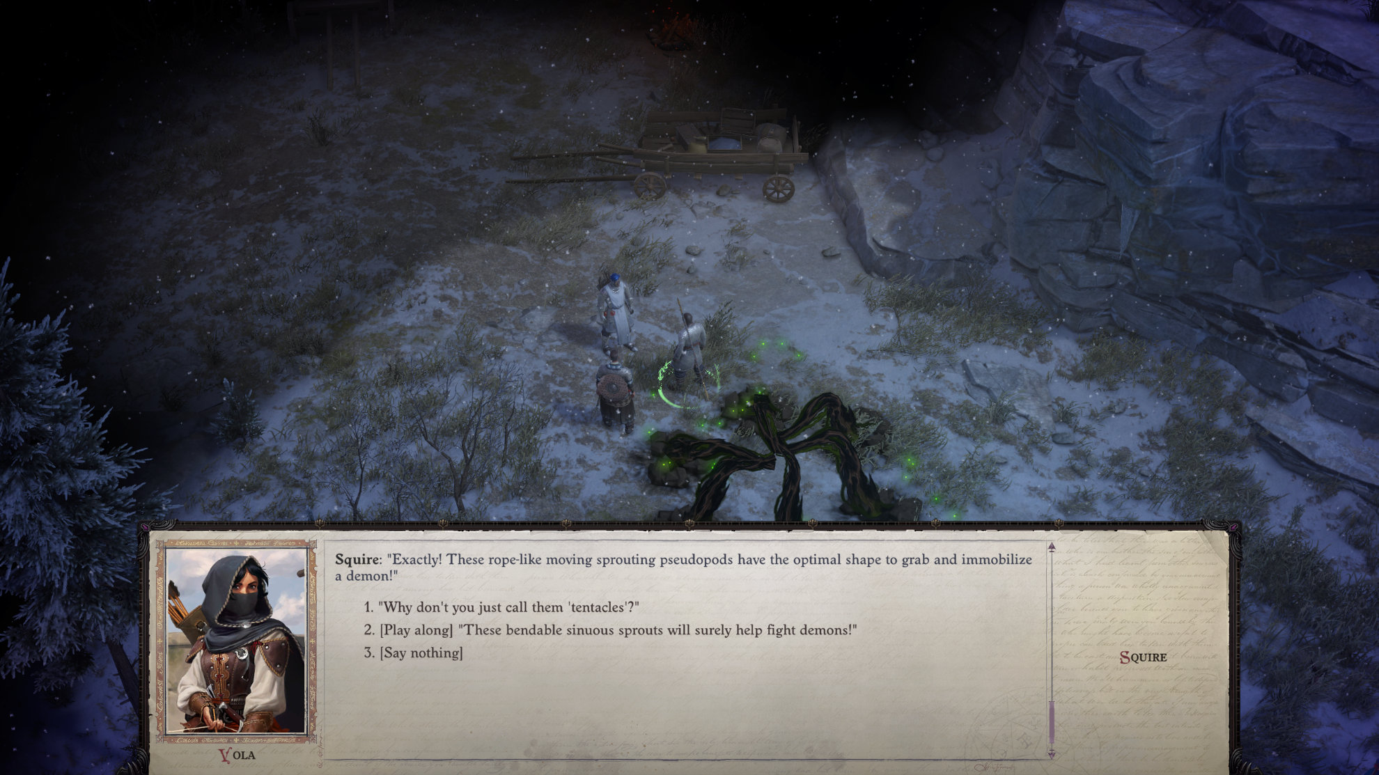 Points also must be given just for how atypical the cast is. Once again, Kingmaker had a few weirdos, but it sure didn’t have a snarky, neutral evil count who acts as your party’s healer, or a paladin who drinks at celebrations and gets along with the more chaotic members of the party. Also, you get two mutually exclusive party members to chose from, one who looks like if a mad scientist stitched together a normal guy and a lizardman, and another who can only be described as a cat-spider-girl who serves those she sees as the strongest and will purr at one point because she’s so happy by the mythical power you just granted her. The fact she’s a love interest is very much appreciated, as are just how many more are here and how many are bisexual options.