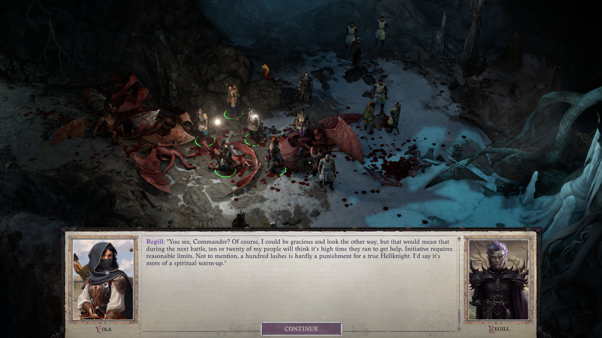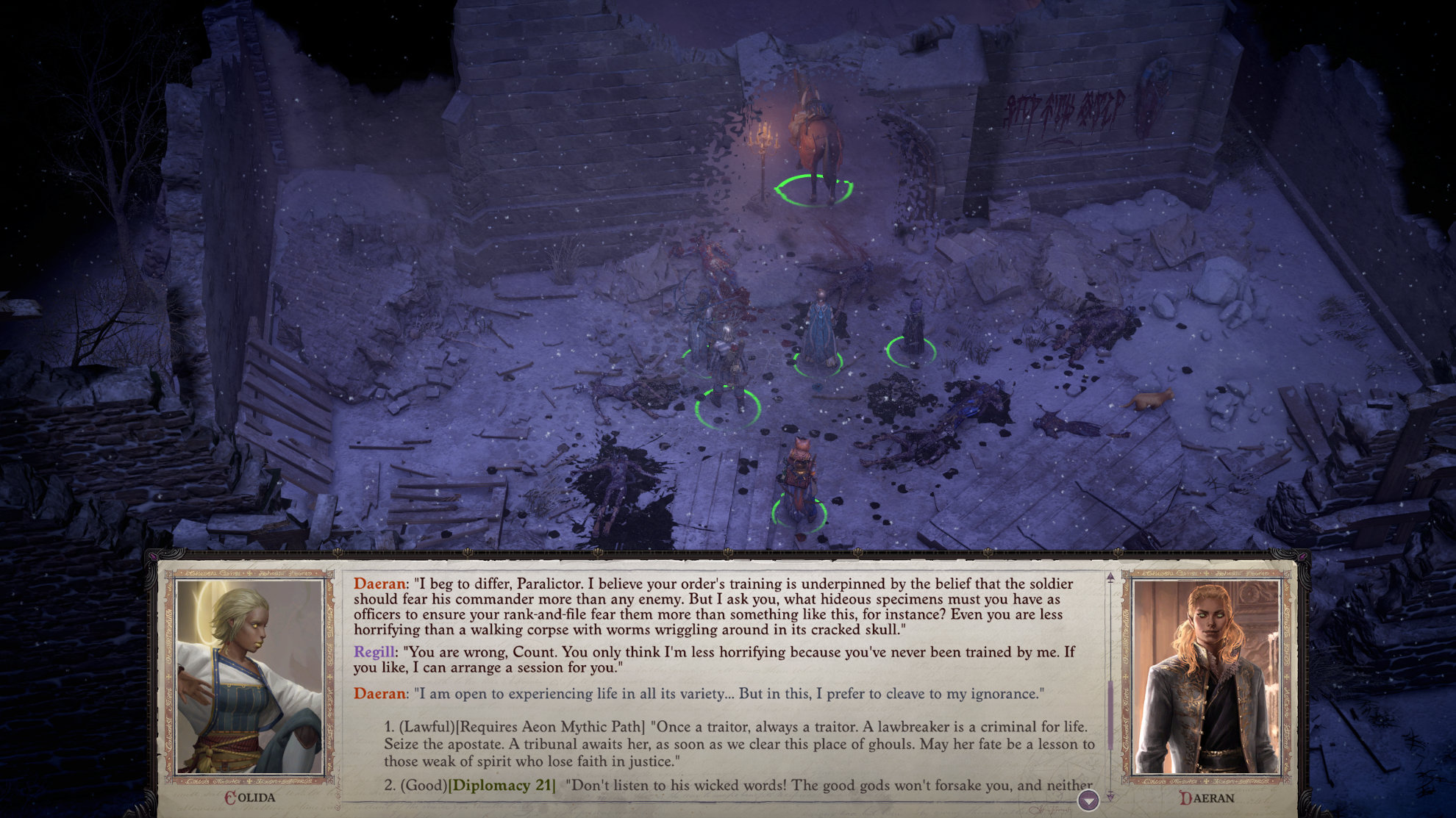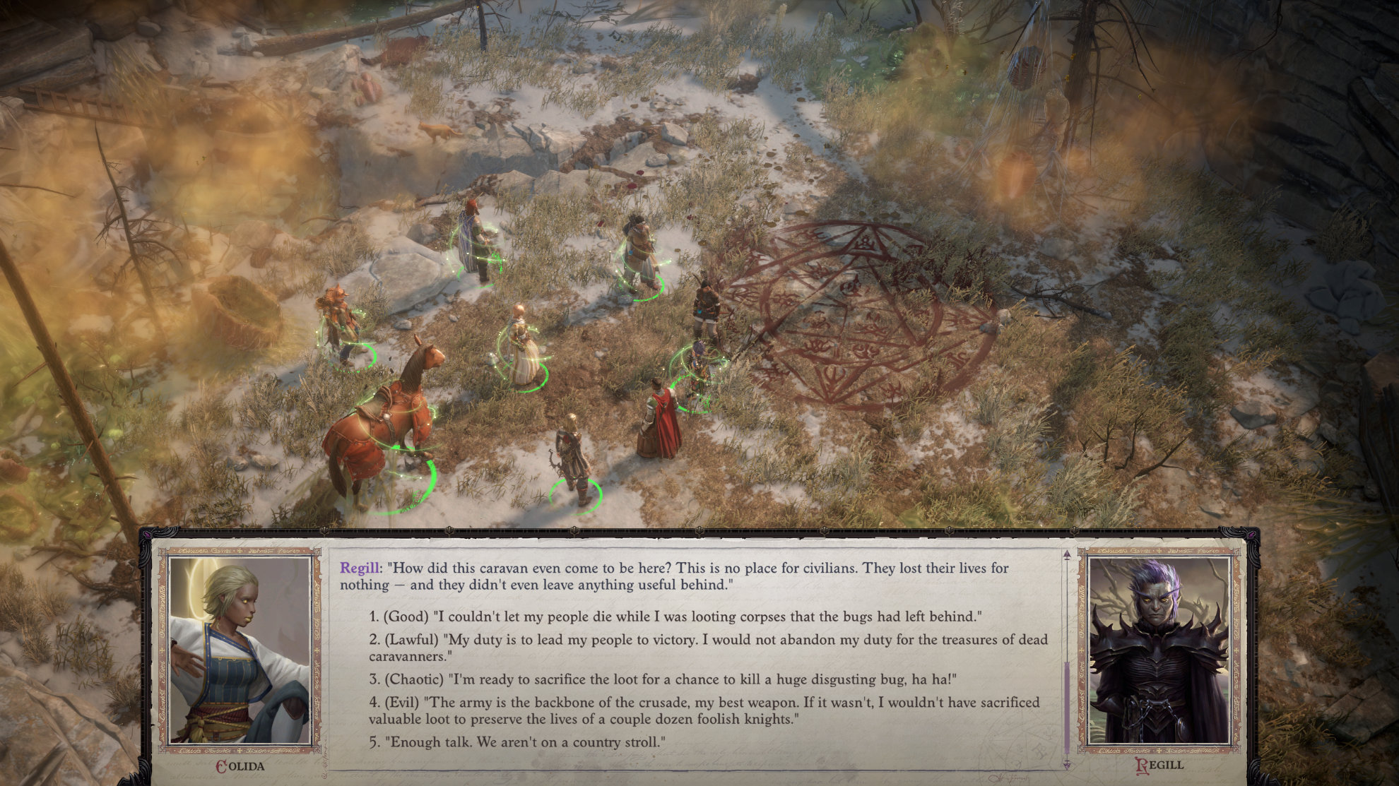 For an example character writing, an assassin named Greybor you hire is actually true neutral, a man who takes killing as a business, but is picky about his clients and targets. He gets along with some of the most unexpected companions, and shows a lot of contradictions in his actions and views, suggesting he’s on the verge of making a big life decision. The lawful evil gnome hellknight Regill also manages to catch one off guard, usually being all about strict order and forcing people into roles at any cost for a greater goal. However, he’s a tad less harsh to those he sees potential in, like a younger hellknight named Yaker, and will actually bend the rules ever so slightly if it can help such people reach their potential. He’ll even have respect for a chaotic commander if you manage to make wise decisions when needed.