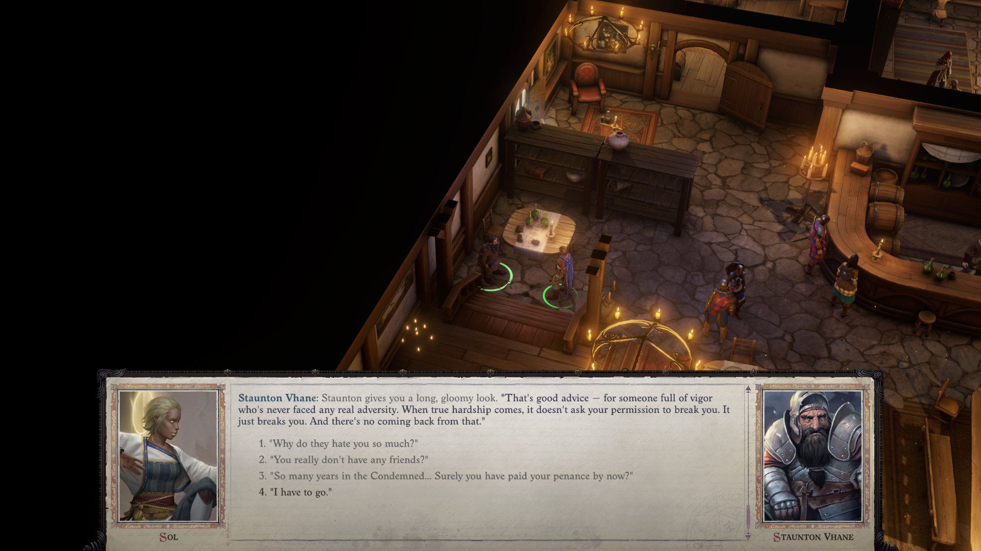 Advisors are replaced by four councils, each populated by an official and some of your companions. Instead of just having a short spiel from one advisor and making a choice to do what they want or not, you get various voices throwing out options and debating before making a call. It was a great idea just in terms of flavor, some of the best writing moments coming during rank up meetings as everyone makes their arguments, and people you’d normally not agree with can make good points and throw out some good ideas to consider.