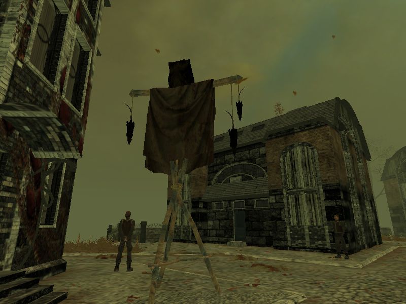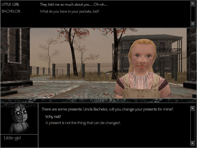 The beleaguered town is split into a number of named areas (Bridge Square, Tanners, Damp District, etc), divided into three main sections adjacent the Gorkhon River (the river doesn't actually exist, though is named similarly to the Orkhon River). In the West of the town is the Polyhedron tower, an unnatural almost Luvcraftian structure, floating above the ground and seemingly constructed from the paper upon which its plans were drawn. To the South is swampland and the closed train station. To the East is the enormous Abattoir and Apiary which houses the workers, both locked to prevent spread of the disease. Amidst this hell are 27 key characters known as Adherents, who are distinct from regular NPCs, each with their own agenda. You must deal with all of them in order to survive and bring about a conclusion - though be careful, since in an apocalyptic situation such as this, you can't really trust anyone. The town is ruled by three opposing dynasties, a triumvirate which balances itself: the Kain family, acting as spiritual leaders; the Subarov family, who deal with law and order; and the Olgimskiy family, who are the financial providers.