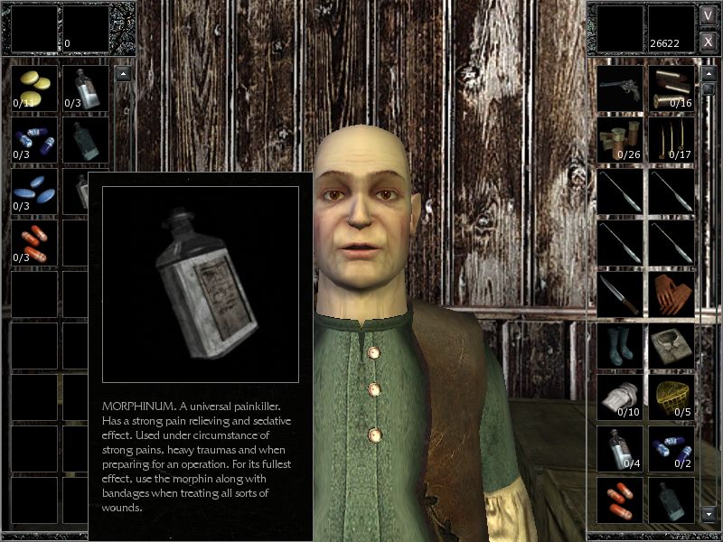 The Bachelor. A dandy from the capital, in a snakeskin jacket and with a bag of strange scientific contraptions. Seeking to discover immortality, the authorities condemn his experiments - he visits the town both on their order and after receiving a letter claiming his hypothesis is correct. This is a chance for redemption, but the superstitious townsfolk don't trust him. Daniel is the easiest character, but also the least interesting since, unlike Artemy, he can't harvest organs or create serums. His special ability is a looking glass which reveals the disease, but it's totally useless.