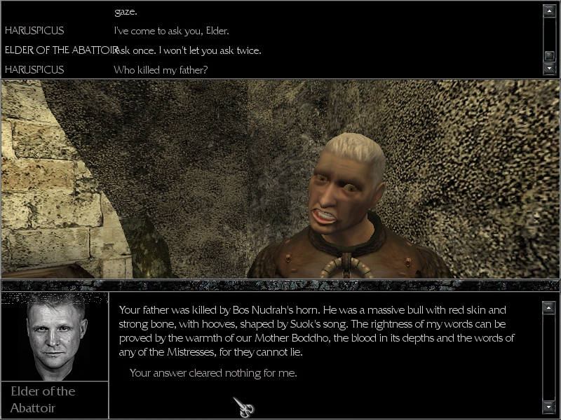 This orphan lives in a poor part of town near the Abattoir. Refusing to join either Notkin's Dualsouls or Khan's Dogheads, he goes about creating mischief on his own. He does, however, have an expert knowledge of the town's layout and secret hiding places. He's also slightly obsessed with the Steppe and the supposed supernatural creatures which roam it at night. Most of though he just gets himself into serious danger, requiring you to bail him out.