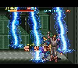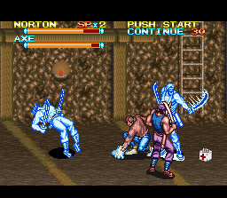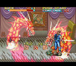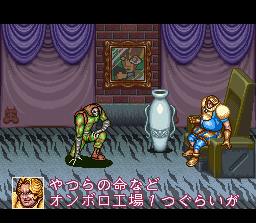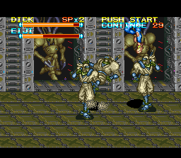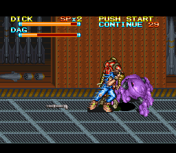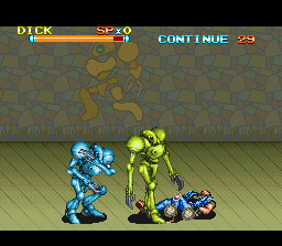 Everyone can taunt with the X button; while seemingly silly, pressing the A button while taunting causes your character to flip out and perform a “Termination Attack,” an impressive display of energy (often manifesting itself as some sort of beast like a dragon or a tiger) that wipes the screen of all enemies. You only get two per continue, so they’re only for the utmost times of desperation. Furthermore, each character has a special attack lending to their unique playstyles. Dick has the most interesting where he literally goes “Super Saiyan” and enters an invincible fury mode (different from Ikari mode) where his punches do massive damage. Elfin can double jump and perform a flaming knee drop, and Kythring can actually put that bazooka of his to good use. Jimmy can carry and shake any opponent he grabs six times before tossing them away, Norton actually activates Ikari mode for his Termination Attack, and M-Frame can shoot bullets out of its hands. It’s impressive enough to have six characters to pick in a brawler, much more so when each has a special technique that no one else contains. Naturally, this game is at its best when you have two players slamming around DM’s hired goons, and the generous amount of continues makes it easy enough for most tandem players to make it to the end.