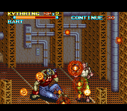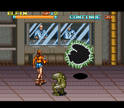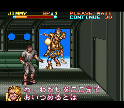Lamentably, when the game came overseas as The Peace Keepers, it lost quite a bit in the conversion process. In a strangely coincidental parallel to Streets of Rage 3 (often thought of as inferior to its overseas counterpart, Bare Knuckle 3), the third game of a beat-em-up trilogy once again turns out to be the unfortunate victim of inexplicable butchering in the localization process. Unlike Brawl Brothers, its stages have not been changed around, so the full game structure is more or less still there. What is NOT there is the music. For some lamebrained reason, the localizers felt the music was obnoxious, unfitting, or otherwise unnecessary. If not a classic, it is at least the best OST of the series and actually adds a lot to the game’s atmosphere. That gets thrown out the porthole in the American version, where all music is replaced with ambiance by default. In some situations, the mere hush of background noise is enough and perhaps preferable, but not for a hypercharged beat-the-crap-out-of-all-enemies fightfest. The noise is actually fairly grating on the ears, particularly compared to a more deliberately ambient game like Secret of Evermore. There is an option to switch to “BGM” mode, but more than half of the game’s OST has been cut out, with one of the less better tracks (the DM labs theme) standing in for most areas. It is inexplicable and inexcusable as to why the localizers would have changed the music around so drastically when there was absolutely nothing wrong with it in the first place.