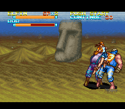 The gameplay is even further refined to make the action tough but fair. The pace is perhaps a bit slower than RBR, but enemies are generally less cheap, and your heroes can actually take a lot of punishment before folding. This increased lifebar is just as well, since you only have one life per continue, but this is compensated by giving you a crapload of continues; thirty, to be exact. Everyone has the standard arsenal: Basic combos, jump attacks, dash attacks, throws, special attacks, and good old Ikari mode, which REALLY causes enemies to fly when thrown. Weapons can also be found, mostly to be thrown (the rocks do a surprisingly high amount of damage if you bean someone with them), and health items can be carried with you as in RBR so long as you don’t use your character’s standard combo.