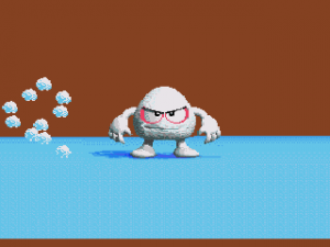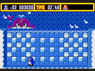 If you ever get tired of doing the story mode, however, you always have the Battle mode to try out. If you thought the single player mode sounded familiar, this is where the whole “Bomberman ripoff” part really becomes evident. You can have up to four players, either controlled by the AI, or four human players, if you happen to have a multi-tap on you. Once you start a battle, your goal is to use your ice blocks to slay the other multicolored penguins on the board. The last penguin alive wins the round, and the first one to win three rounds is the winner of the match. In true Bomberman fashion, there’s also different items that either help or hurt you, and some stages have hazards to avoid. Much like the single player mode, the battle mode’s best described as “Bomberman, but slightly different”.