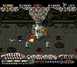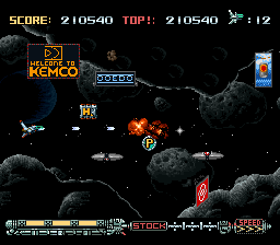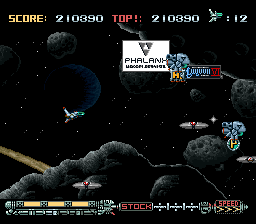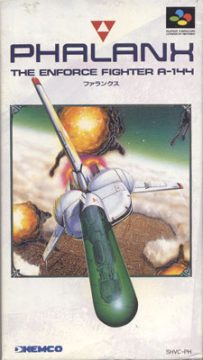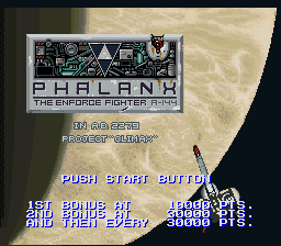 While Phalanx was initially released for the X68000, its SNES port is far more well known. This was published by Kemco but developed by Zoom themselves, which makes it a fairly close port, but it does suffer a bit from the transition. The introduction scene has been drastically cut back, completely omitting the human characters, probably due to lack of ROM space. They still show up, but only in the cutscenes and at the ending. The color palette in some areas has changed a bit. The signs in the Advertise Area have also been altered to feature Kemco products rather than Zoom products. The one big improvement is that the X68000 version requires that you destroy a weapon before you use another one, while the SNES one lets you switch between them. You can also switch your ship speed during the game in the SNES, where in the X68000 one you had to set it at the beginning at the menu. Also, for some reason, the missiles had limited quantities in the X68000 version, where you can use them as much as you want in the SNES version. Overall, the SNES version is a little easier too.