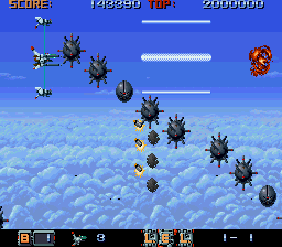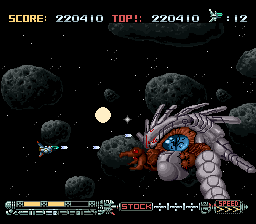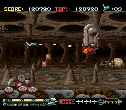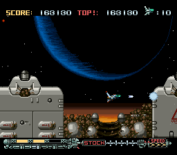 While a fairly standard shoot-em-up, Phalanx sets itself apart in few ways. It’s one of the few shoot-em-ups of the era where you have a life bar, so you can absorb several hits before losing a life. You can also store weapons and switch between them (at least in the SNES and later versions), or sacrifice one of them to use as a smart bomb, whose effect changes depending on the weapon being used as a source. There are four types of main weapons – Laser, Homing, Energizer, and Ricochet – as well as three types of missiles. It also offers a nice variety of weapons that are all useful and, in a move still unusual today for the genre, allows the player to keep and switch between several at once.