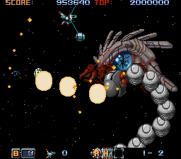 The biggest addition is a new arrange version, which features more comical graphics, including different pre-level pictures. Sometimes these changes are subtle, like adding the Zoom mascot, the cat Dolucky, to the ship hangar at the beginning of the game, but other times it’s more obvious, like turning the tendrils of a boss into long, female legs with high-heels at the end of them. Many of the enemies are also altered in rather silly ways, plus other changes are made, like the background in the battleship level being changed into an actual photograph of a city. It’s not exactly Parodius, but if you’re already familiar with the game, it’s worth playing through again just to see what was changed.