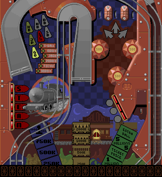 The easiest table of the bunch, Steel Wheel is themed after the Old West. Points are very easy to pick up in this one, especially if you get the skill shots and all the add-on cars for your train (which result in all kinds of bonuses for you down the line). Great banjo music and a nice brown and grey color scheme round this table out. Hitting the ramps repeatedly will eventually start giving you massive points, especially if you hit them several times in quick succession. The skill shot is probably the easiest in the game, since there are only three possible lanes for the ball to roll into at first, and there’s enough surface for the ball to roll on that if you’re going down the wrong lane, a simple nudge will send it into a different one. Of course, excessive nudging does lead to a tilt, but Pinball Dreams is surprisingly lenient about that…
