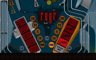 The hardest table here, appropriately enough. Nightmare takes place in a graveyard, and has a steeper slanted table than the other three, which means your ball is going to be much harder to launch up and easier to lose. On the flip side, though, skilled players can earn far more points on this table than the other three, due to its many opportunities for jackpots by hitting the ramps a lot. Nearly every ramp hit on this table will increase the jackpot. I love the music for this table. Strangely, the menu picture calls this table Nightmare, but only the word Graveyard appears on the table itself. This was fixed, however, for GameTek’s handheld adaptations.