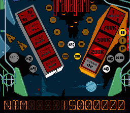 The SNES port was handled by GameTek, evidently based on Spidersoft’s DOS version. This port is quite surprising as hardly anything had to be cut (outside of the usual Nintendo censorship); even the music remains almost 100% intact (though a few samples were changed, and the intro tune is trimmed a bit). Some colors are changed for tables like Steel Wheel, and a few sounds were changed, but aside from that it’s actually a very good port. About the only change Nintendo made to the game was on the Nightmare table, as there are some crosses in the table artwork that had their arms removed. As a strange note, the SNES port was published in Japan by Coconuts Japan and GX Media under the name Pinball Pinball. The game remains unchanged aside from the weird new name – 100% of the text remains in English. (I suppose LCD-segment displays don’t handle kana very well.) There are a few minor bits in the table artwork that don’t look quite as good due to conversion issues, but it still looks and plays pretty well.