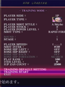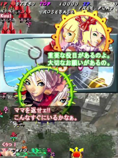 Arrange mode changes the control scheme from the original Pink Sweets game. The A button now controls the ship’s shot, and Rose Hips’ shot. The B button now exclusively controls the Rose Cracker. Not Pressing the B button will cause the Rose Cracker to charge up, creating the aura shield that can be used to damage enemies and absorb bullets. Since the buttons are now separate, players can now fly around with their aura shield while also firing their shot. Pressing the B button when the Rose Cracker is fully charged will fire the Rose Cracker like normal. Holding the B button down and releasing will fire the powerful Hado-cannon, which functions just like its Ibara incarnation. Unlike the Rose Cracker, which can be fired freely, the Hado-cannon sacrifices one the player’s Rose Hips. Players start the game with just one Hado-cannon, with the number of remaining Hado-cannons is displayed in the upper left corner of the screen, under the player’s remaining lives. If the number of remaining Hado-cannons reaches zero, the player will lose their Rose Hips until the number increases. However, the only way to gain Hado-cannons is by dying, which still only increases the counter by one. Players can only hold a maximum of four Hado-cannons at any given time. Because of its limited supply, the Hado-cannon should only be used in specific situations for the maximum number of points.