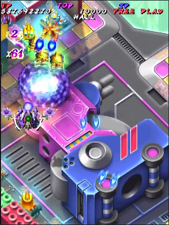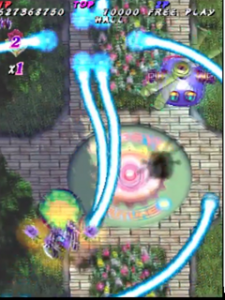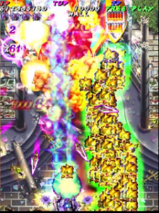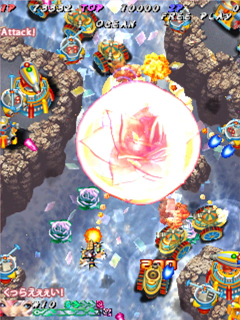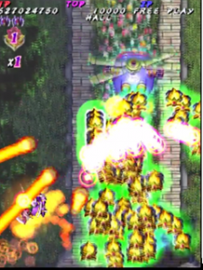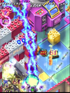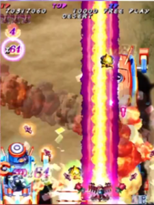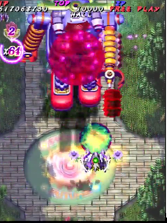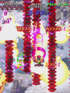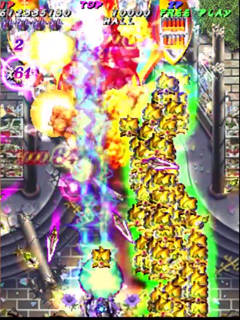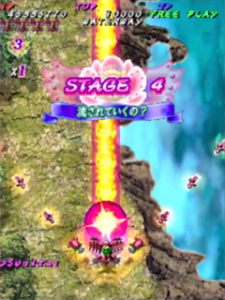 Scoring in Pink Sweets Arrange mode is quite different than its original arcade version. Players no longer gain points by just attacking enemies and bosses, instead only receiving points when something is destroyed. The key to scoring in Arrange mode is the multiplier in the top left corner of the screen, under the Hado-cannon counter. The multiplier will increase (x1, x2, x4, x8, x16, x32, with the highest being x64) when the player destroys an enemy, or enemy bullets with the Rose Cracker. Destroying them with the shot will not increase the multiplier, but still add 500 points times the current multiplier to the player’s score. Bombing the trees in stage one to release the birds (a call back to Battle Garegga Stage 2) adds 500 points times the current multiplier to the player’s score, usually averaging around 2 million points per bomb (at max multiplier). The multiplier resets back to x1 after about a second of not destroying an enemy, or hitting something with the Rose Cracker.