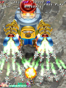 Just like in Ibara, each character/ship in Pink Sweets possesses four different shot variations, which are selected via specific button combinations when selecting a character. There is a brief explanation of each character’s main shot and what it does in their character description above. For a more detailed explanation of how each shot type acts for each type for every character, please visit the “Pink Sweets Basics” link in the Links section below, as it’s just too much information and wouldn’t make sense in this format. When starting a game, players start with what is known as the “Basic Shot”, and is only used when they have collected zero power- up items. Collecting the Rapid Shot power-up causes the ship to fire in a more concentrated manner, usually towards the front of the ship, while the Wide Shot will fire the same amount as the Rapid Shot, just over a wider spread. What’s nice about Pink Sweets is that collecting a Power-Up item increases both Rapid and Wide Shots, and can be powered-up three times. Players also can collect options (called Rose Hips), but there are only the one shot type, and players can only have two of them at once.