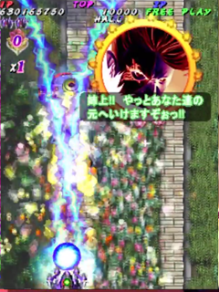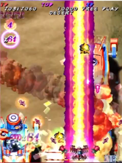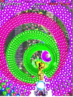 As is tradition in Yagawa’s games, Pink Sweets contains alternate gameplay modes than just the standard Arcade mode, which consists of seven stages. These additional modes are accessed on the title screen, after putting a credit into the machine. Holding up on the joystick and pressing start will trigger Harder mode, where enemies release suicide bullets when destroyed, and more bullets overall; but, both the player’s ship and enemy’s bullets have smaller hit boxes in Harder mode. Holding the joystick in the down direction will activate Extended mode, which guarantees entry into Pink Sweets‘ hidden second loop. The third hidden game mode is Score Attack, and is accessed by holding down the A and B buttons when starting the game. In Score Attack, the game begins in Stage 6, with a 5 minute time limit. The goal of this mode is to gain as many points as possible within the time limit, which is extended by one minute every one million points. The “standard” version of Pink Sweets is the third revision, which will give players infinite lives while in Score Attack mode; however, other revisions of the game may only give players a total of three lives in Score Attack mode.