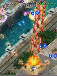 Now for the true key of scoring, entering Multiply Mode, which is a fancy name for “infinite lives.” Players will automatically enter Multiply Mode after collecting a 1-Up when having 5 extra ships in stock. Instead of adding another ship, their visible ships are instead being reduced to two, but no longer decreases when the player loses a life. This mode can be triggered as early as Stage 3, just after the midboss. (There a total of seven stages.)