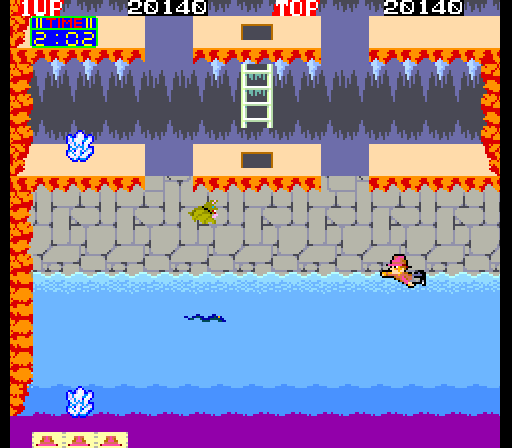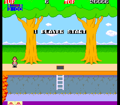 Unlike the original Pitfall II, Harry has to find the three keys that will let him locate the hidden three treasures: a crystal ball, a diamond and a crown. You start on the surface, swinging on vines over the crocodile swamps and lava pits, dodging logs, fireballs, spiked balls and evil apples & acorns that fall from very happy looking trees, caterpillars that move up and down, and bolts of lightning. In some cases, you also have to jump across floating logs in the swamps before they sink, and there are even some areas that require you to jump from vine to vine before you reach safety. At one point you have to go down into the caverns, and the ladder down is guarded by a giant crocodile-man statue that spits fire at you.