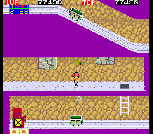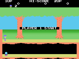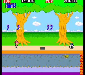 One thing worth mentioning about the SG-1000 port is that it received two releases. Due to the incompatibility of the color palettes between the SG-1000 and the Sega Mark III, the original release doesn’t display some colors properly if played on the Mark III. Harry, for example, doesn’t have his original flesh tone. Instead, it’s a dark brown that blends in with some of the backgrounds. The re-release adjusted the colors properly. The only real way to tell the two versions apart by looking at the MyCards is to look for extra copyright info on the label. That’s the re-release.