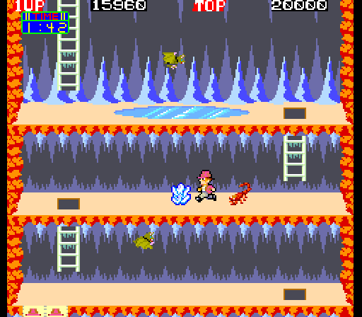 Below the surface are even more hazards. The scorpions have returned, along with the bats, electric eels and poison arrow frogs. New obstacles include ravens (which have replaced condors), falling stalactites, icy ponds, pairs of poison arrows, giant spike beds, and brick walls that descend and try to crush Harry. Returning from the original Pitfall! are the tar pits that open and close. A new addition is the mine carts. Harry can ride in them, but they can (and will) come to a sudden stop if they hit a barricade. The only way to exit one is to jump and grab one of the many rings scattered around, hanging from the ceilings. Harry can hang from these rings as long as necessary, and can even use them to jump into other mine carts.