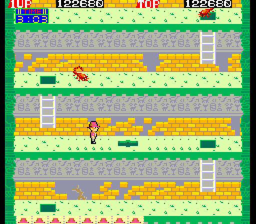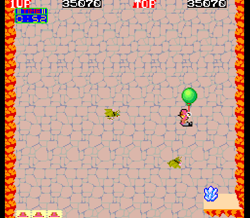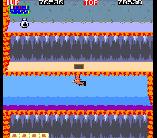 Minor treasures like money bags, gold bars and crystals are found scattered throughout the caverns, along with gold goblets and treasure chests. The balloons make a return appearance, and even more importantly are actually needed to get the final treasure and finish the game. The timer and life counter have returned from the original Pitfall!, which means that there are no more red crosses to be had. You lose a life if you collide with a creature or an obstacle. The timer is no longer set for twenty minutes, but three. Completing a stage will bring the timer back up to three minutes. The map is roughly the same size as it was in the original 2600 Pitfall II, but here it’s divided into four levels. This means that if you get to the end of one level, you start at the beginning of the next one, and can’t go back although the end and start points are actually close to one another.