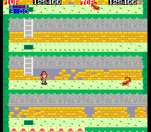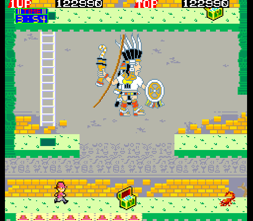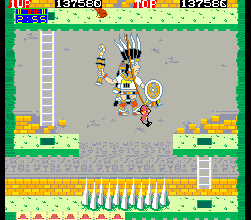 The ending, unfortunately, is nothing to write home about. You get a short congratulatory message, and the game urges you to try again. To its credit, the game looks and sounds great. Harry is now wearing a definable outfit, including black shoes, purple jacket and a purple hat. Everything has an appropriately bright and colorful look, and as you go down into the caverns, the backgrounds take on more of a Mayan style, with large wall murals and brick layouts a lot like what were discovered in Mayan ruins. The Pitfall II theme plays during the game, and it’s never sounded better. However, due to the addition of the timer and lives counter, the game is also very difficult.