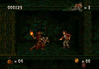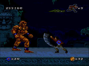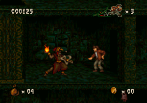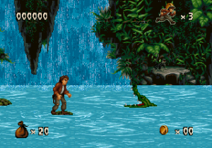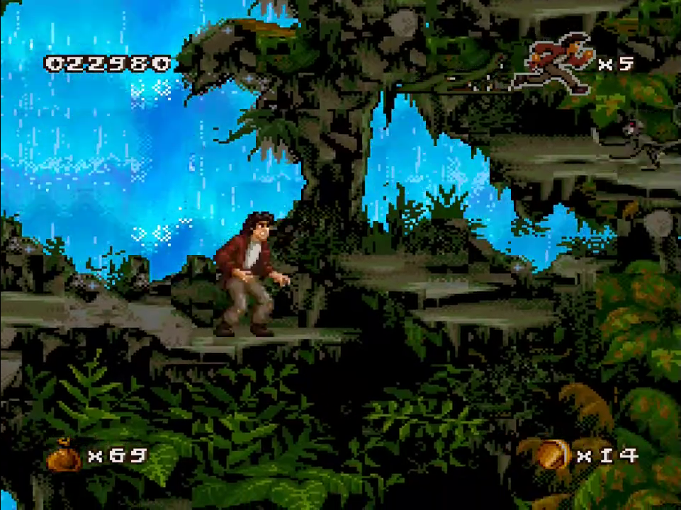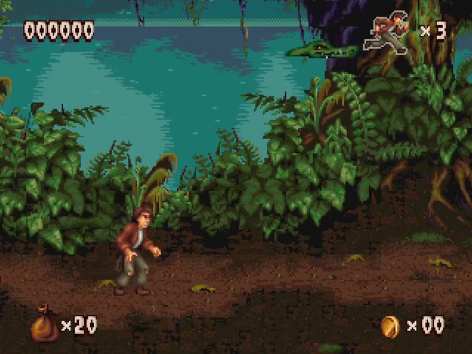 No matter the platform it was released for, Pitfall: The Mayan Adventure is a lush looking game. The level of detail in the backgrounds is fantastic, no matter what stage you’re in. The characters are all superbly animated, as it appears that not a single frame was spared. The Genesis version looks good, but the graphics aren’t as colorful and they look very dithered, and the soundtrack lacks the robustness of other versions. The SNES version takes full advantage of the system’s expansive colors, and sounds fantastic, but it’s missing some effects – the shimmering lake in the background of the first level is gone, for example. It also runs at a lower resolution (256×224 versus 320×224 of other versions). The 32X version looks slightly nicer than either of these, but it runs at 30 FPS, making for a much less smooth experience, and the soundtrack is identical to the Genesis version. The Sega CD version is basically the same as the Genesis cartridge version, but adds some FMV for the opening of the game and a CD-quality soundtrack. The Jaguar version is very similar to the 32X release but it runs smoother, but the sound is very similar to the Genesis version. The Windows version is the best, offering brighter graphics than all of the other versions. It runs smoothly and features the same soundtrack as the Sega CD version. This also includes a hidden bonus level based on Earthworm Jim, since it was ported by the same team. The Game Boy Advance version, released several years later, is handily the worst, as the colors are overly bright (to make up for the non-backlit original GBA screen), the screen is too zoomed in, and there’s very little music – and what music is there suffers from the GBA sound chip. The Sega CD, 32X, Windows, GBA, and Jaguar versions also contain three additional levels: the Palenque Ruins, Tomb of Palenque, and Jaina Island Falls.