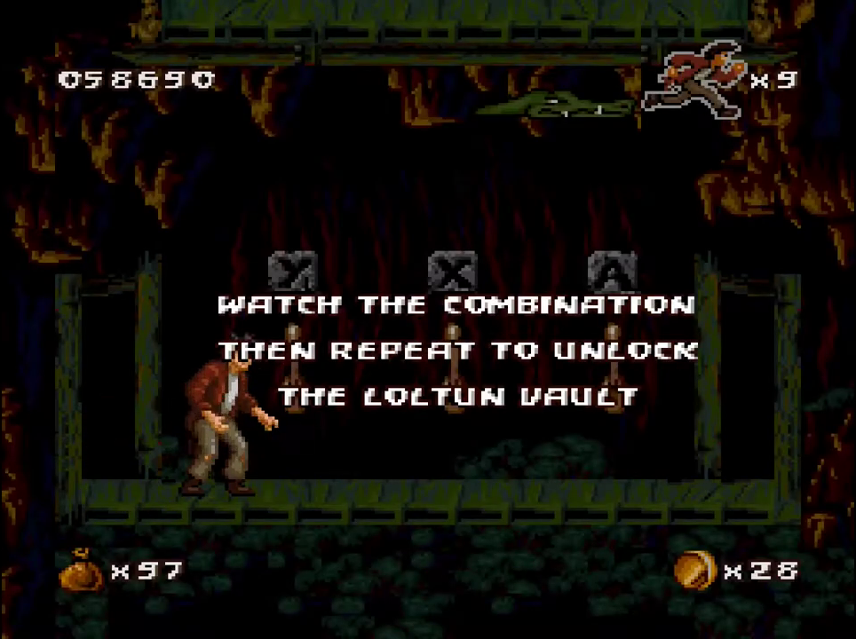 There are also warps that will lead you to something called The Loltun Vault. In it, you’re playing a game of “repeat the tones” using three levers. Every so often upon successfully repeating a tone, a treasure will drop down for Harry Jr. But while all of this is going on, the solid rock ceiling is slowly descending. The tones gradually become more complex in nature, forcing you to go as swiftly as possible. If you succeed, you’ll get a bonus, usually a one-up. If not, you get crushed.