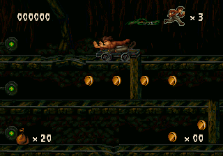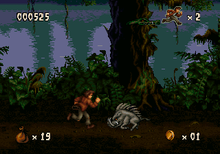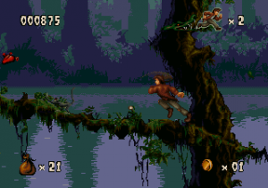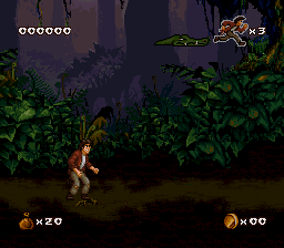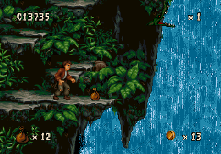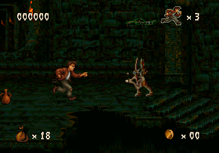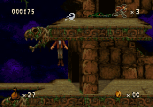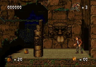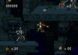 The game looks and plays a whole lot like Aladdin (Genesis) and Earthworm Jim, with lots of large levels that zig and zag back and forth, with complex scenery that looks cool but can be complicated to navigate. It also inherits its sluggish controls which prioritize animation over responsiveness. Still, Harry Jr. is more agile than his father ever was as well. Not only can he swing from vines like his old man, but he can also climb ropes, crawl, bounce off of spiderwebs and bungee flowers, latch onto pegs and cords, pull levers and even ride ziplines. Mastering these skills will help you defeat the denizens that dwell in the jungles and ruins. Harry Jr.’s rescue mission starts in the Ceiba Jungle, which leads to the Xibalba Falls, the Tazamul Mines, the Lost City of Copan, Copan Temple, the Lakamul Rain Forest, Yaxchilan Lagoon, the Balankanche Mine, the Tikal Ruins and finally to the Temple of Tikal, where the final battle against the Warrior Spirit takes place.
