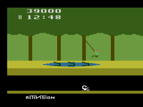There is no music in the game to speak of, aside from a short victory fanfare when you pick up a treasure, and a short dirge that plays when you lose a life. There are barely any sound effects either, aside from the sound of Harry’s jumps, his Tarzan yell, and the grinding sound you hear when a log runs him over. Harry is very well animated, and unlike a lot of early 2600 games, everything looks like what it’s supposed to. You can tell you’re in a jungle, and you’ll never confuse a scorpion for a crocodile.