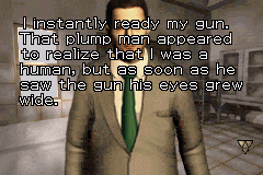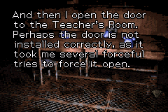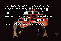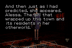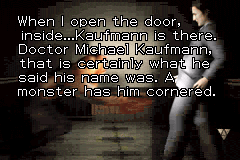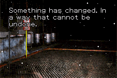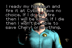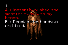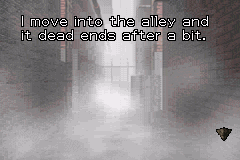 The game looks and sounds like many other visual novel do. Text is imposed over CG stills from the PS1 game’s FMV and new renders made for the game. Occasionally, the game uses clips of the FMV, but they run at a low frame rate and look super grainy and muddled. There is the occasional animated flare, like the streetlights flashing across Harry’s face as he’s driving in the prologue, or enemies shuffling around. Luckily, the game sounds a bit more interesting than it looks. The GBA’s sample-based set up works well here, doing a strong job of creating the crackling radio static, the groans of monsters, or Harry’s footsteps walking down stairs. In that way, it’s akin to sound novels, providing atmosphere more with sound than visuals. Music is a subdued affair, consisting of ambient soundscapes that occasionally become more complex as the dramatic moment calls for it, like meeting Lisa for the first time or encountering monsters.