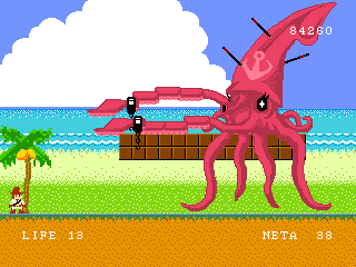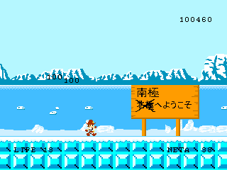 Pole no Daibōken ("Pole's Great Adventure"; the hero's name is also sometimes transliterated as "Paul") puts you in the shoes of a cowboy-type guy, whose girlfriend, Sharon, has been kidnapped by a ruthless poacher. In treading through six generic video game-esque stages, Pole must fight through legions of captured animals, who acts as enemies. Sort of. Most regular enemies are humans wearing animal mask, while bosses include gigantic lions, snakes, and polar bears. Whatever messages about the evils of poaching are totally muddled when you're massacring (admittedly, not exactly helpless) animals, but that's also the point. The cutscenes are displayed in a realistic-ish fashion - as realistic as four colors can allow, anyway - and completely clash with not only the cartoony "box art" (as shown when you begin the game on the Wii system menu) but the in-game graphics as well.