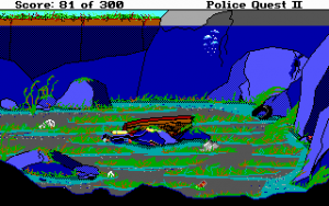 Police Quest 2 fixes both of the major snags from the first game. For starters, you’re a detective at the outset, sidestepping all of the boring patrol stuff. And secondly, the driving segments are completely gone. All you need to do is enter your car, type in your destination, and you’re off. Throughout the whole game, you’re on the tail of Bains, looking over crime scenes for evidence, taking blood samples, running license plate numbers, and reporting in with the lab for analysis. It’s quite a bit more involving – and far more interesting – than anything that happened in the first game. At one point, you even get to put on a diving suit and screen the bottom of a lake to look for clues. It also uses the more advanced SCI0 engine.