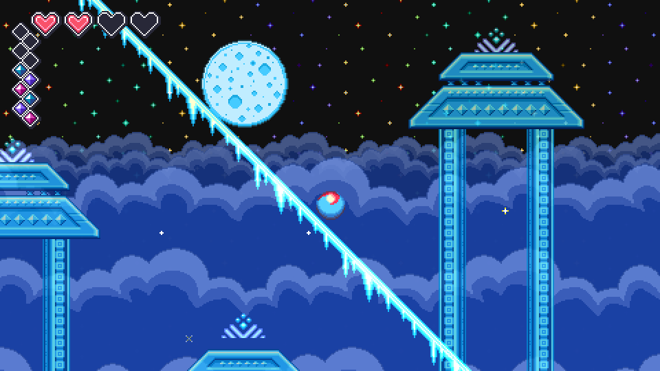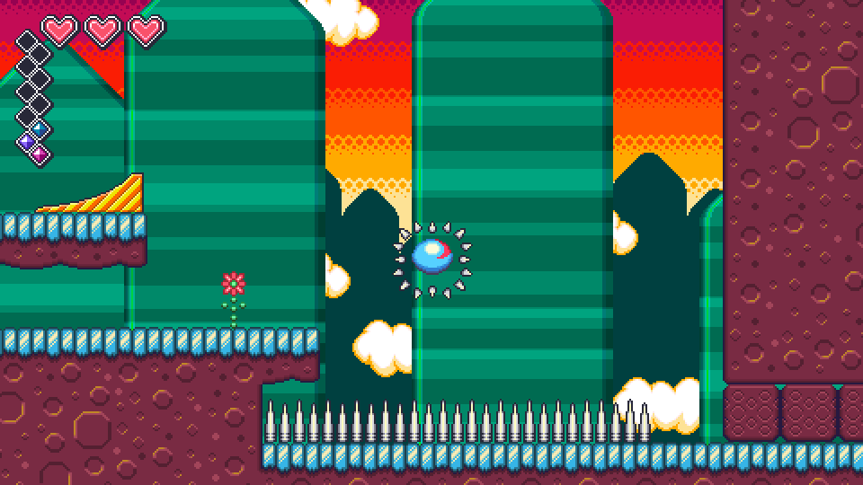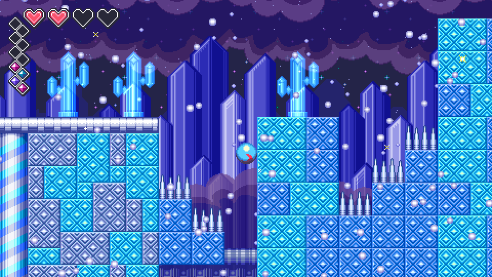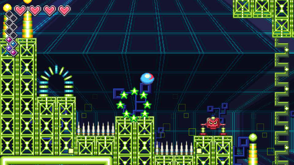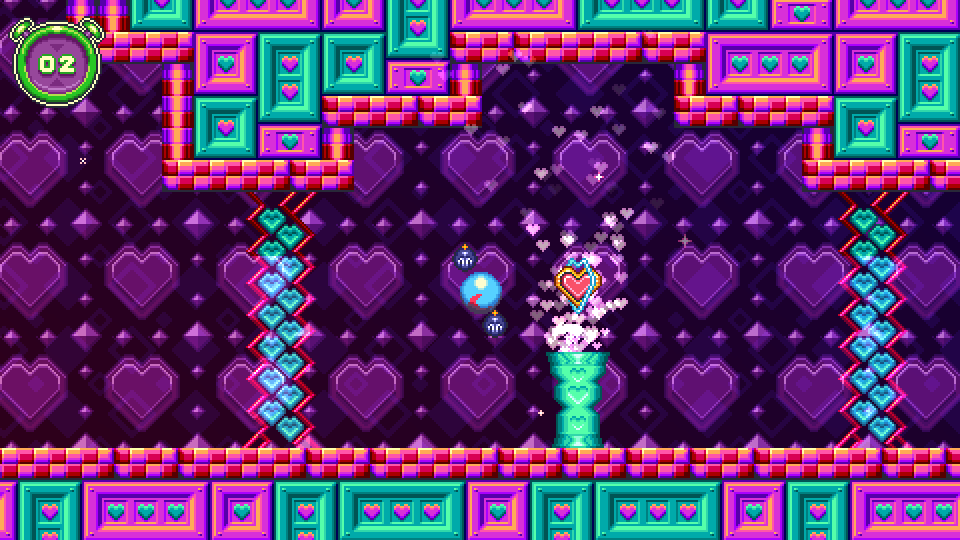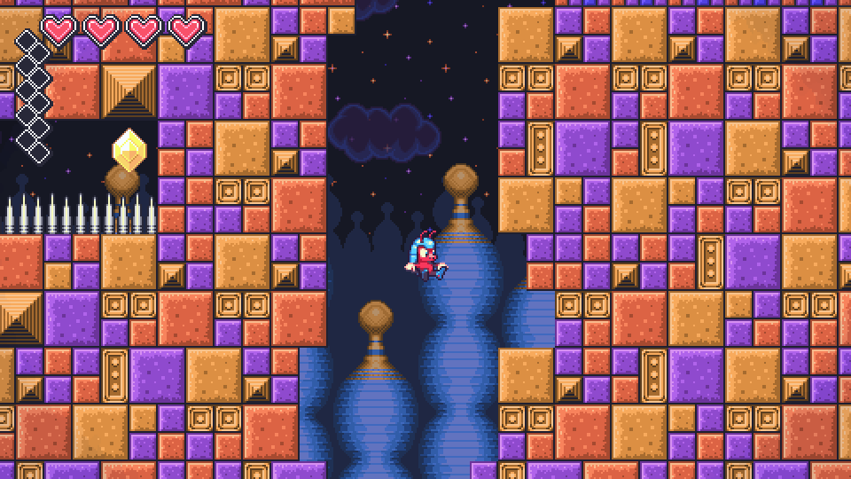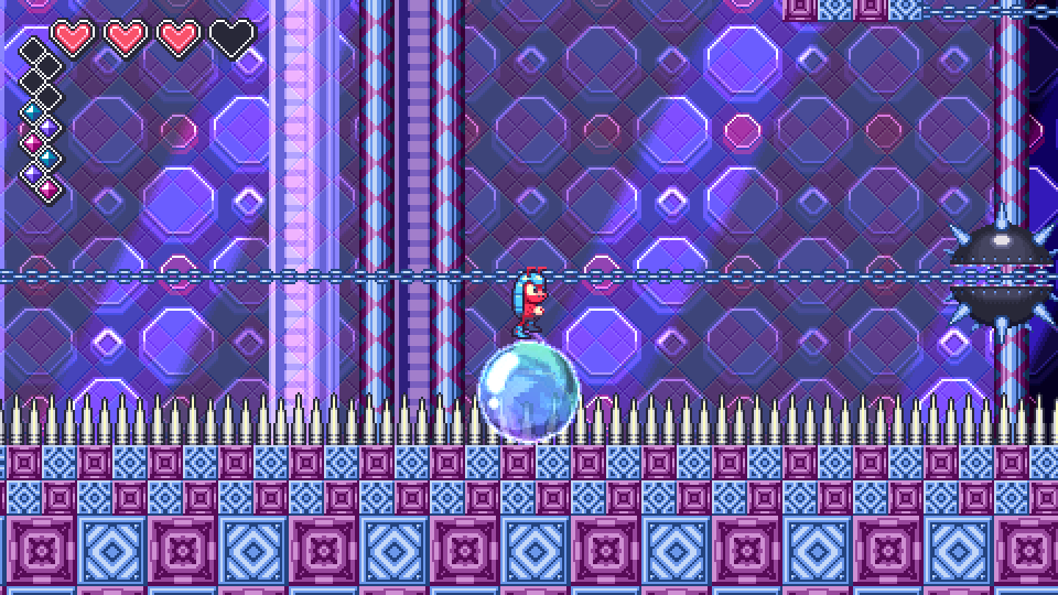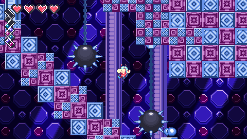 It’s worth holding onto them even when exploring, as they’re crucial to uncovering the three crystals hidden within each level. Collecting enough crystals opens up a handful of alternate worlds and Heart Palaces, where you can upgrade your health by conquering challenging stages under a very tight time limit. Where and how the crystals are placed complement the game’s mechanics and level designs nicely. Some require you to gain more height by jumping on enemies or ricocheting off two adjacent walls, while others ask you to pay attention to your surroundings and solve small puzzles.