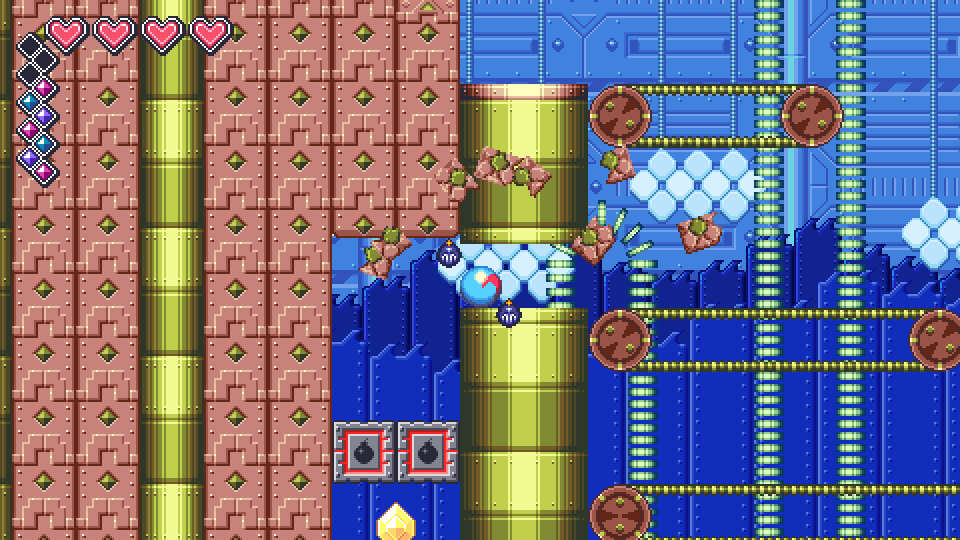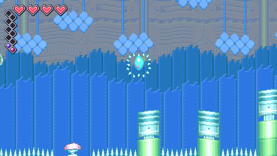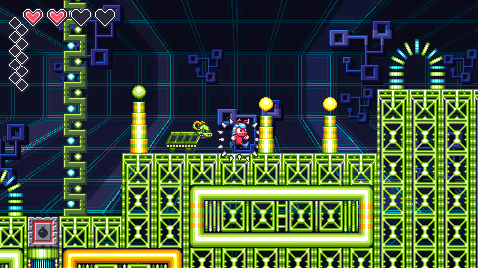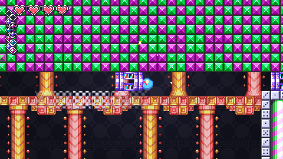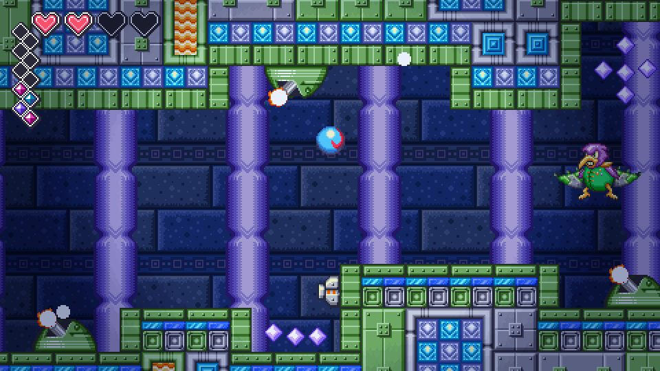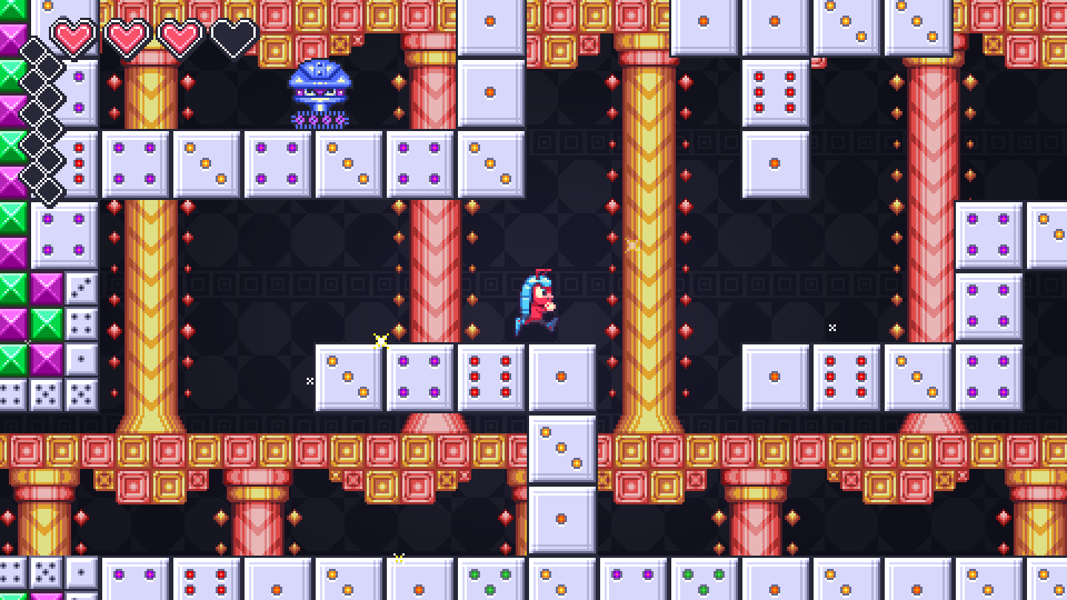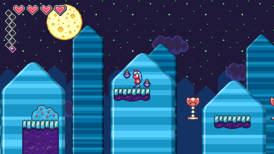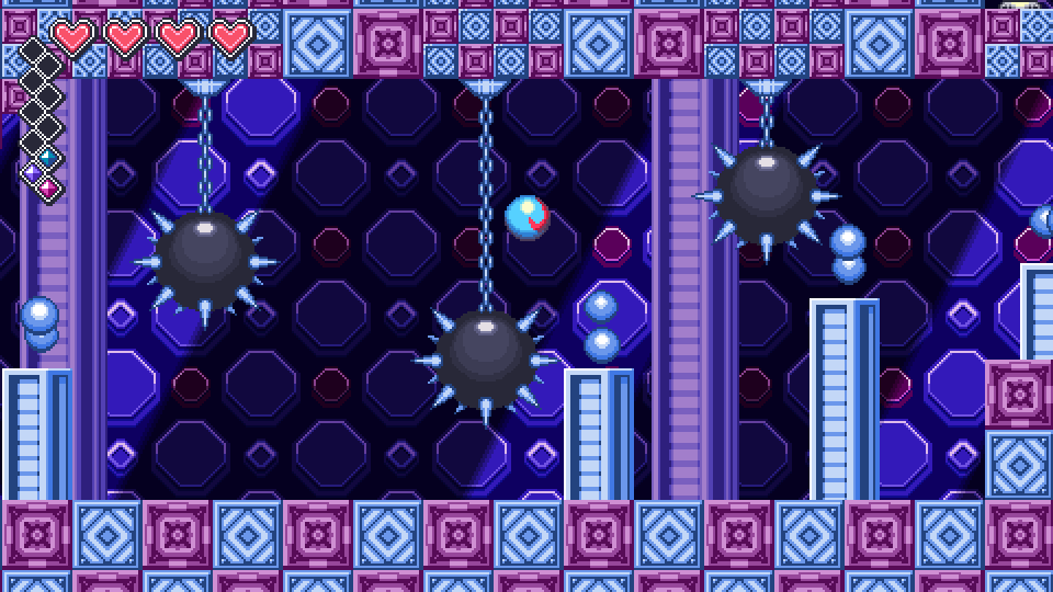 It’s worth holding onto them even when exploring, as they’re crucial to uncovering the three crystals hidden within each level. Collecting enough crystals opens up a handful of alternate worlds and Heart Palaces, where you can upgrade your health by conquering challenging stages under a very tight time limit. Where and how the crystals are placed complement the game’s mechanics and level designs nicely. Some require you to gain more height by jumping on enemies or ricocheting off two adjacent walls, while others ask you to pay attention to your surroundings and solve small puzzles.