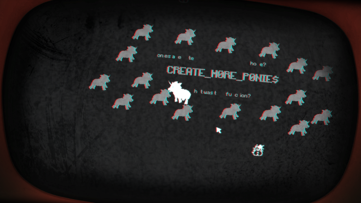 While the game uses tricks from self-aware horror games and creates a dead, gloomy atmosphere, it’s very much a comedy, and a great one at that. The idea of Hell being a terrible video game about being a magical pony is so brilliant and simple that it’s amazing nobody has done it before. The game also has a really fitting style, creating this mix of different graphics to sell the strange story it tells, along with some creative little bits of corruption style sprite art. The music is also rocking, making the pony segments (once you hack it to make them actually playable) a surprising bit of fun.