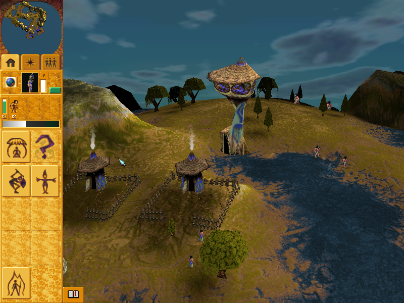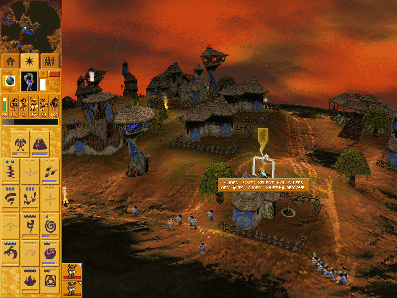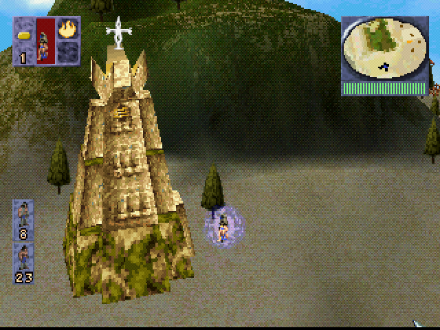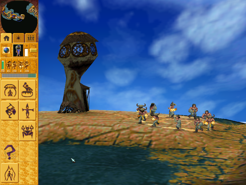 But on the highest settings, The Beginning is still compelling despite its age, popping with (questionable) personality. Bullfrog pulled no punches with this effort, and it shows: a smooth-rolling, curved-perspective globe takes advantage of the contemporary prowess of Direct3D (built on a souped-up Magic Carpet engine), special powers rip up and warp the landscape in never-before-seen detail, and a handful of highly-produced New Age tracks—peppered liberally with random wails and distant war-whoops—coo ominously to wind-swept wooden flutes throughout. Perhaps Bullfrog felt it was necessary to make a good first impression, as the game itself would throw longtime fans for a loop.