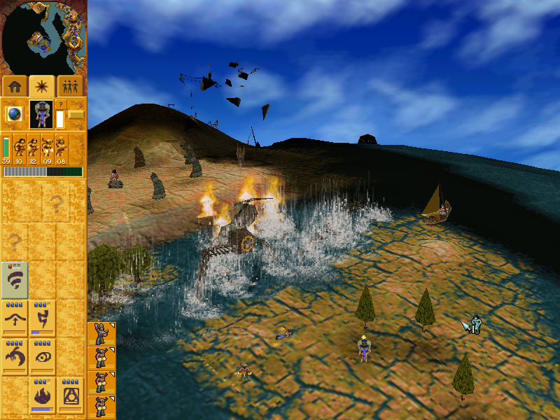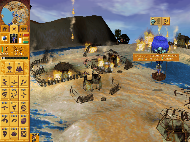 These units range from the simple, such as Warriors and Fire Warriors (particularly deadly in Guard Towers or in balloons) to Preachers, who can arrest enemy followers in their tracks with their (decidedly Christian-looking) sermons. What’s more, if they preach for long enough, enemy followers will even switch sides, making penetration into enemy territory exponentially deadlier with theologians in tow (a rare touch of realism in what is otherwise a narrative desert). Later in the campaign, players also gain access to the feeble but pyromaniacal Spies, who can infiltrate enemy bases and silently light buildings or trees on fire. The whole game consists of these five units, and yet the interplay between them obviates the need for any more.
