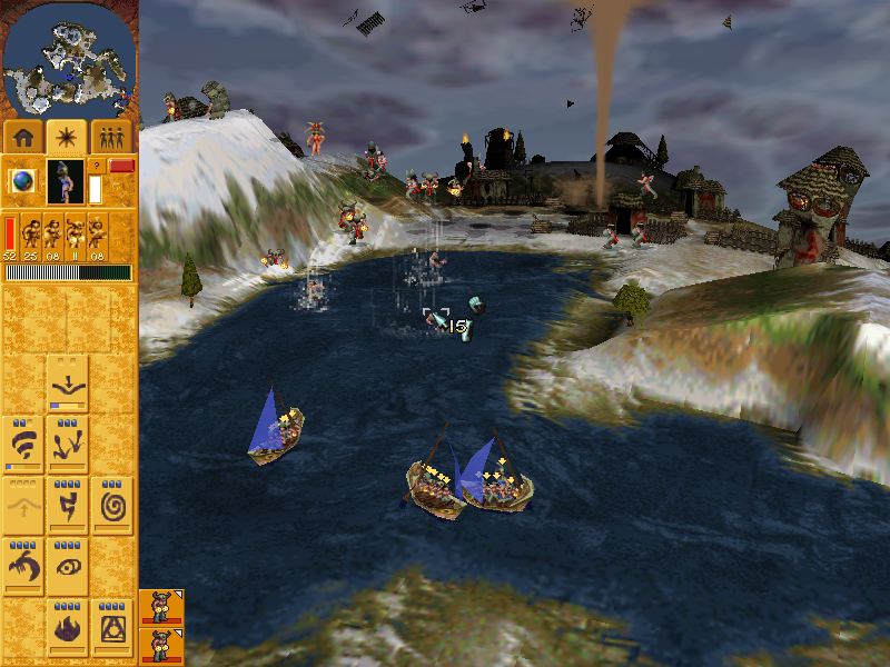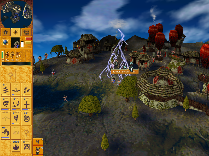 As for her offensive spells, the most basic—and most frequently used—is the ‘Blast’ spell, which can send targets flying outwards or even into the sea (making drowning much more viable and, morbidly, fun in this Populous). It is indispensable in saving the physically weak Shaman from direct melee attacks and even for boosting units onto higher planes, introducing a mechanic absent from many of its RTS brethren: gravity, which all higher-tier players must master to win. Next up is ‘Lightning’, a powerful equaliser which can set buildings (and trees) on fire, ‘Swarm’ (which sends down a band of locusts and causes enemy units to run in terror), and ‘Convert’ (which dyes Wildmen in its caster’s colors).